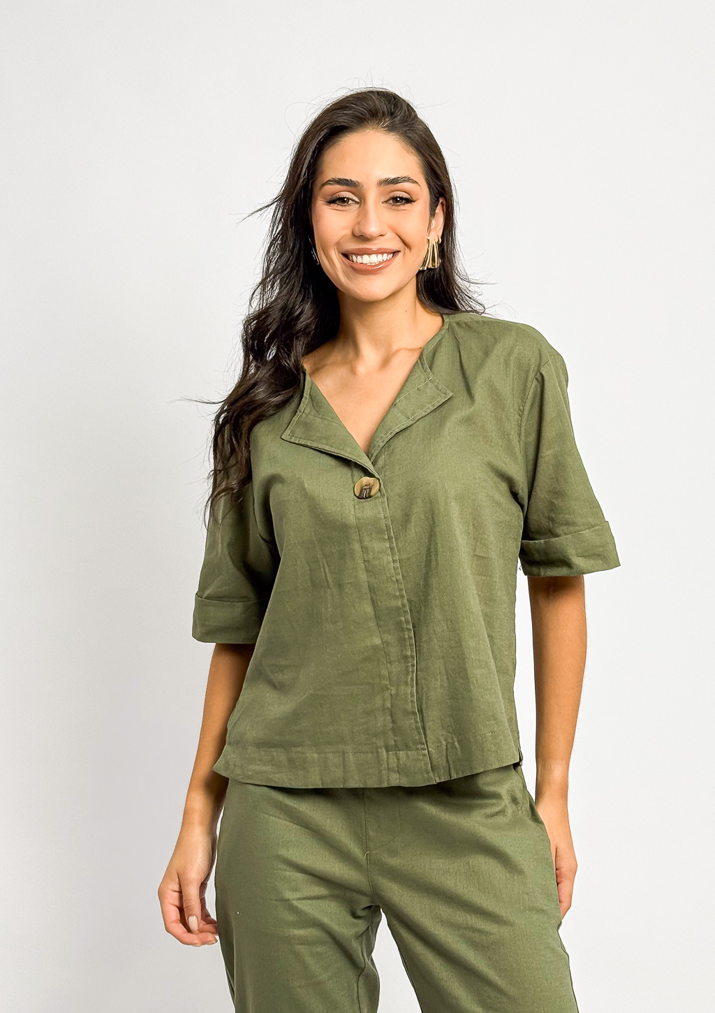 A Blusa Ampla Decote V Gola Botão é uma peça atemporal feita