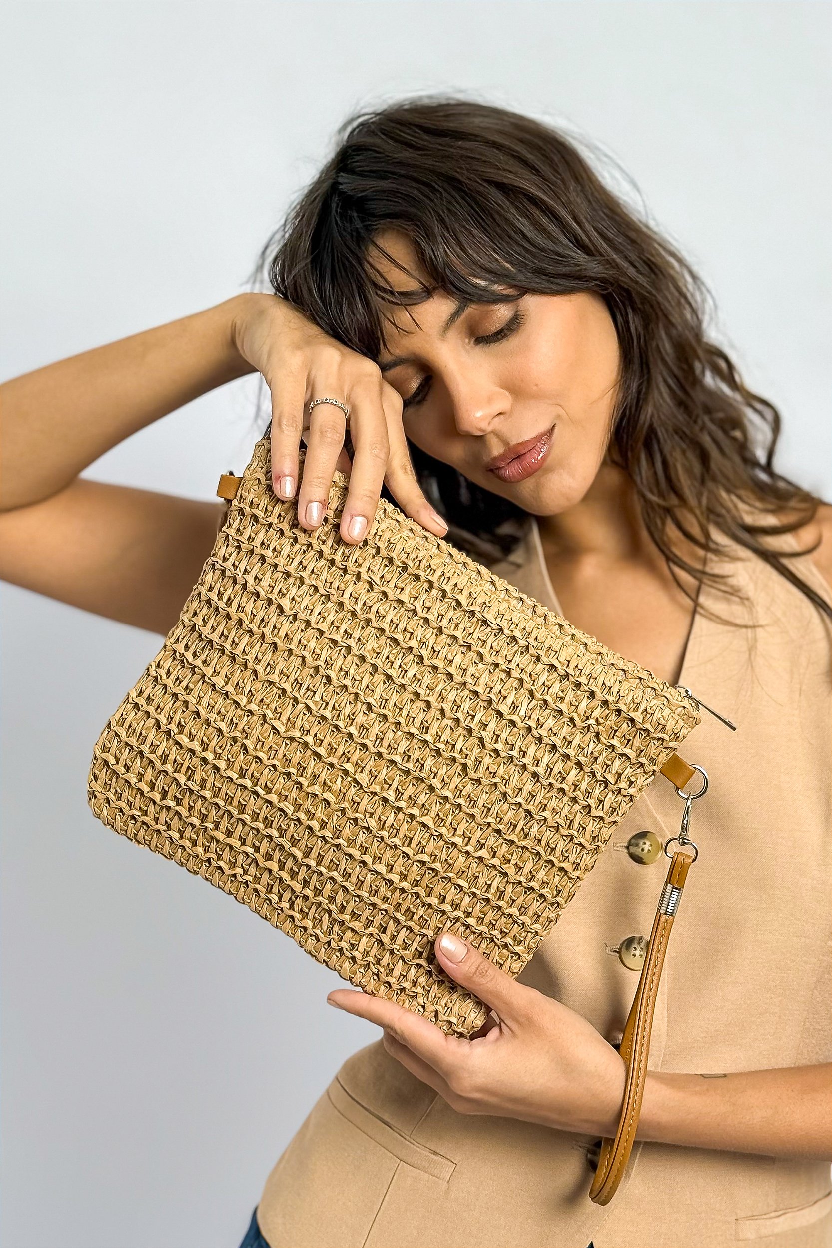 Ela possui modelagem prquena com zíper, textura trançada, alça curta na lateral e detalhe em franja.
