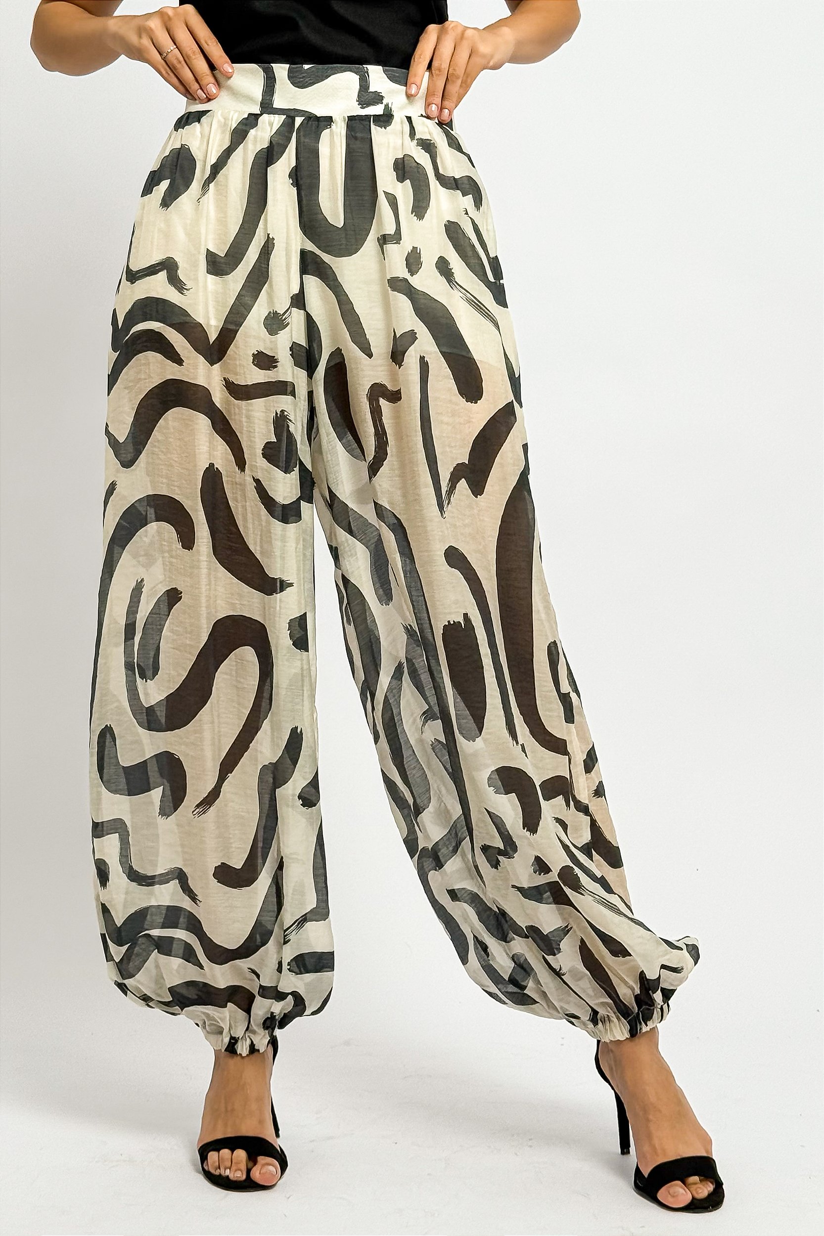 Calça com caimento fluido, tule estampado com desenho abstrato, modelagem
