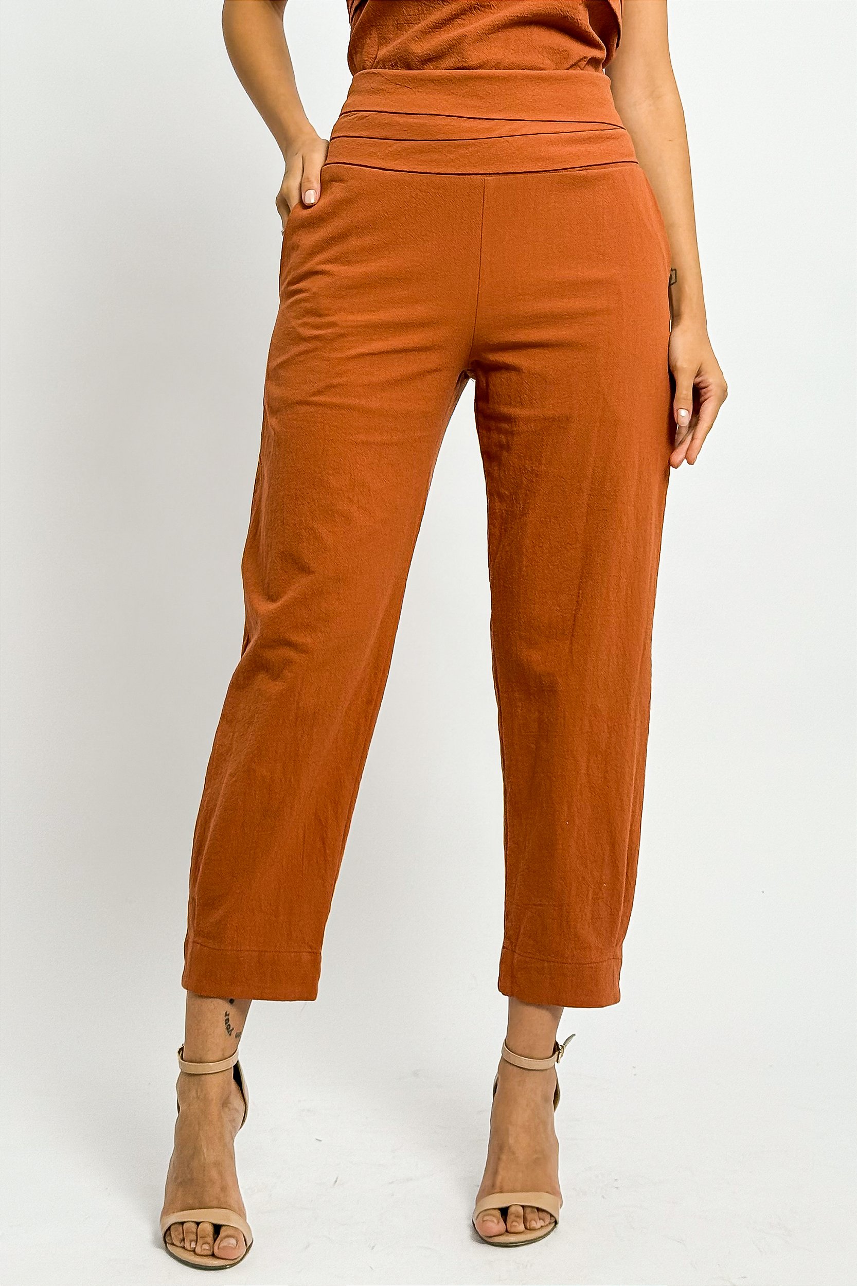 Calça cenoura confeccionada em algodão, bolsos faca e elástico na parte de trás do cós.