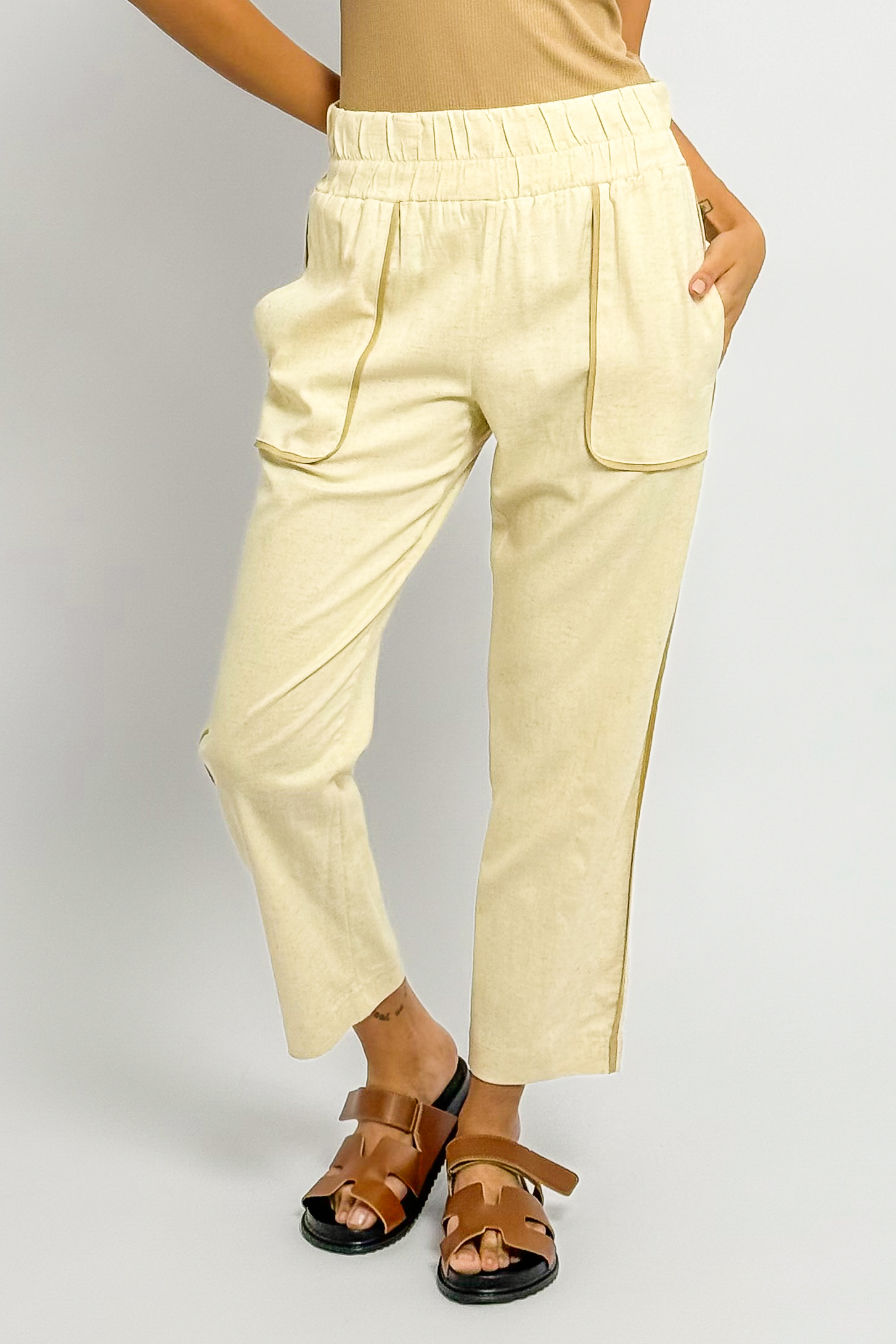 Calça confeccionada em viscose com linho e elastano, cós largo com elástico, comprimento mais curto, detalhes