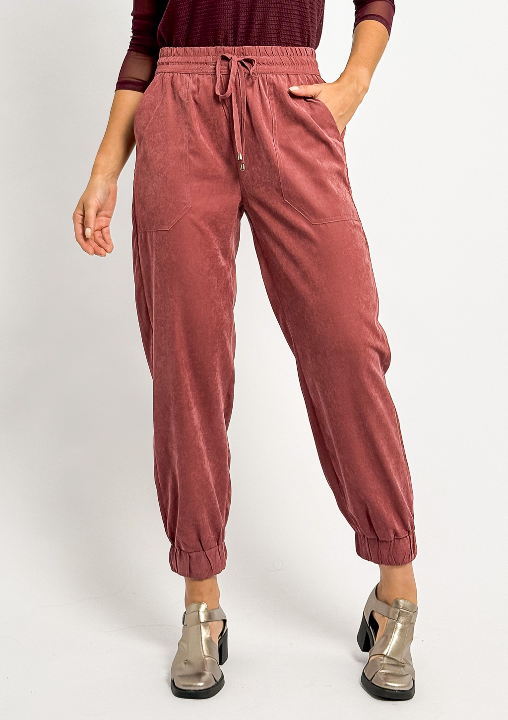 e amarração frontal, bolsos faca, caimento soltinho e barra mais justa com elástico.