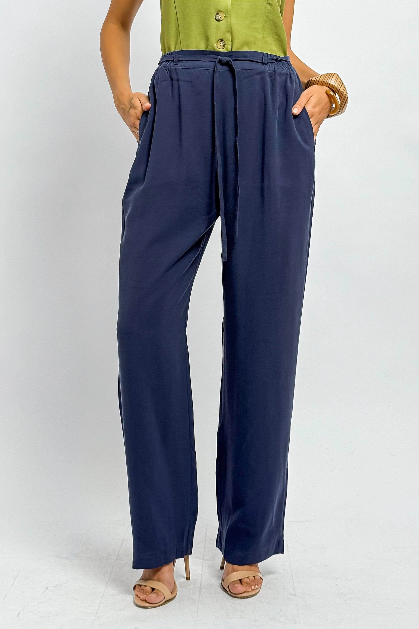 Calça confeccionada em viscose e poliéster, possui cós de elástico com amarração.