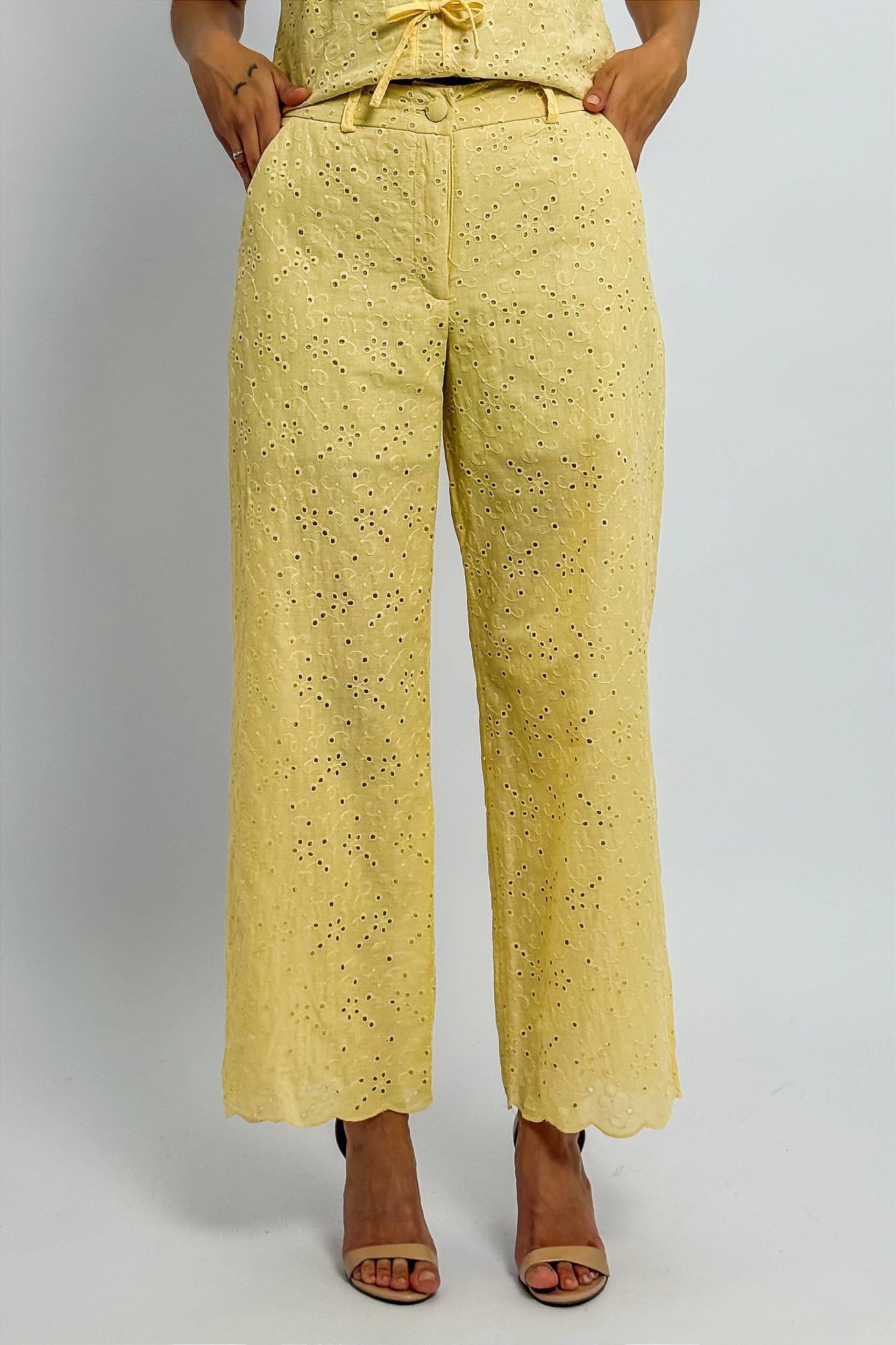 Calça confeccionada em laise, com fechamento em botão, modelagem soltinha e detalhe na barra.