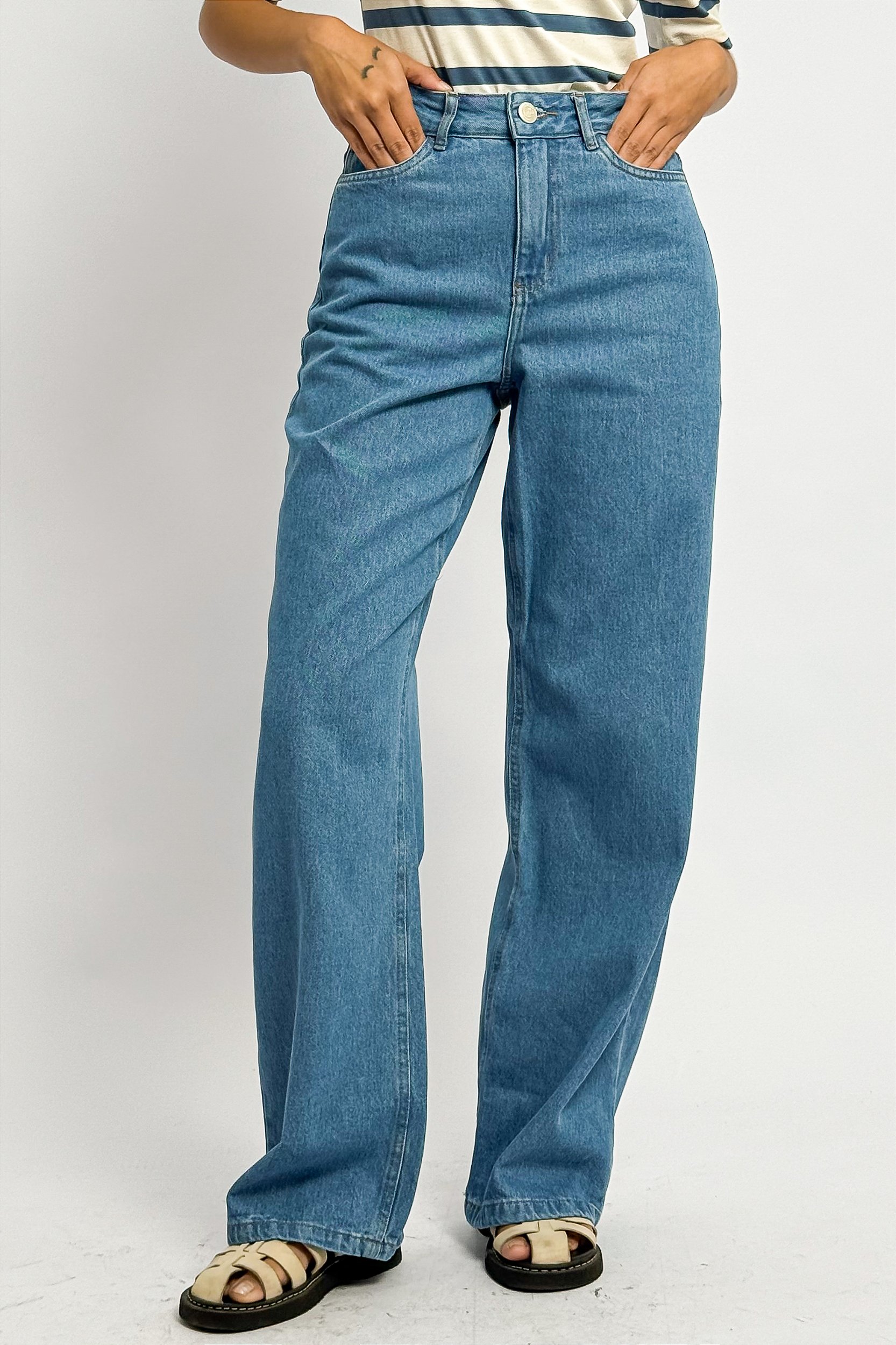 Calça em tecido de algodão, modelagem wide leg - aquele meio termo entre flare e pantalona - e cintura alta.