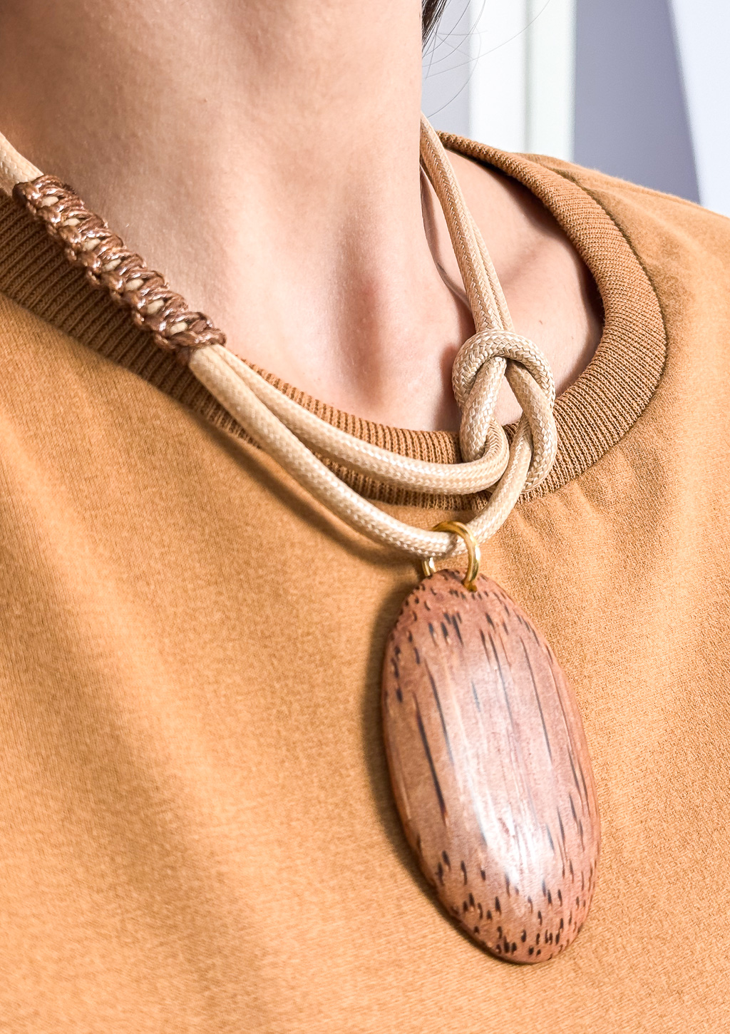 Colar curto em cordas com nó lateral, trançado no tom marrom e pingente de madeira.