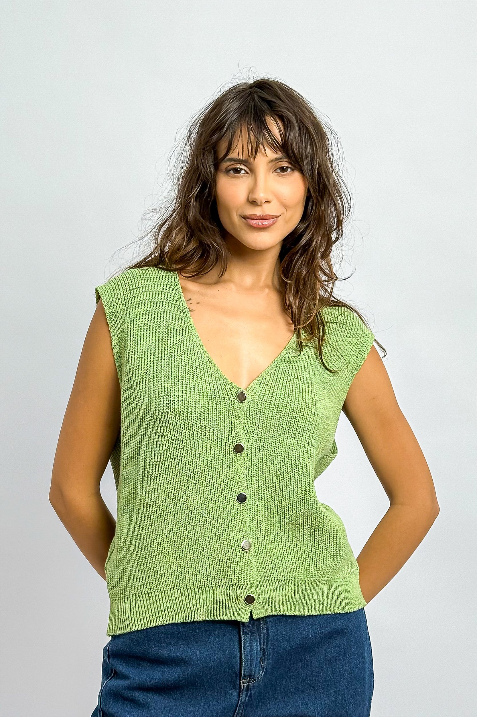 O Colete Tricô Cava Decote V Botões traz conforto, leveza e estilo.