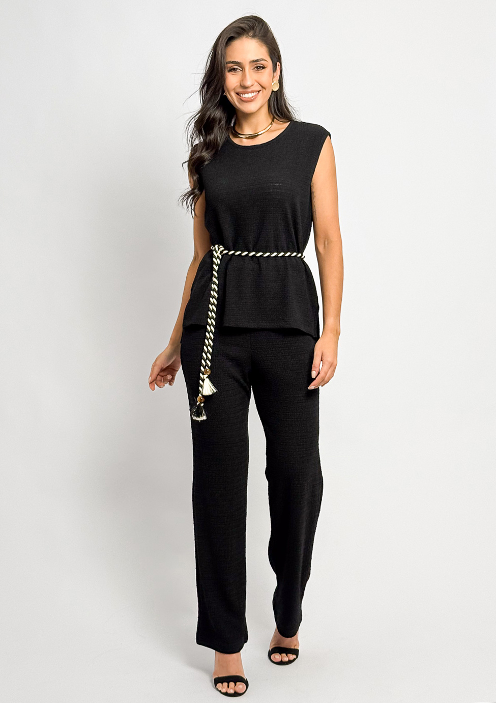 A modernidade fica por conta do tecido e a amarração em corda preta e branca da blusa, eles