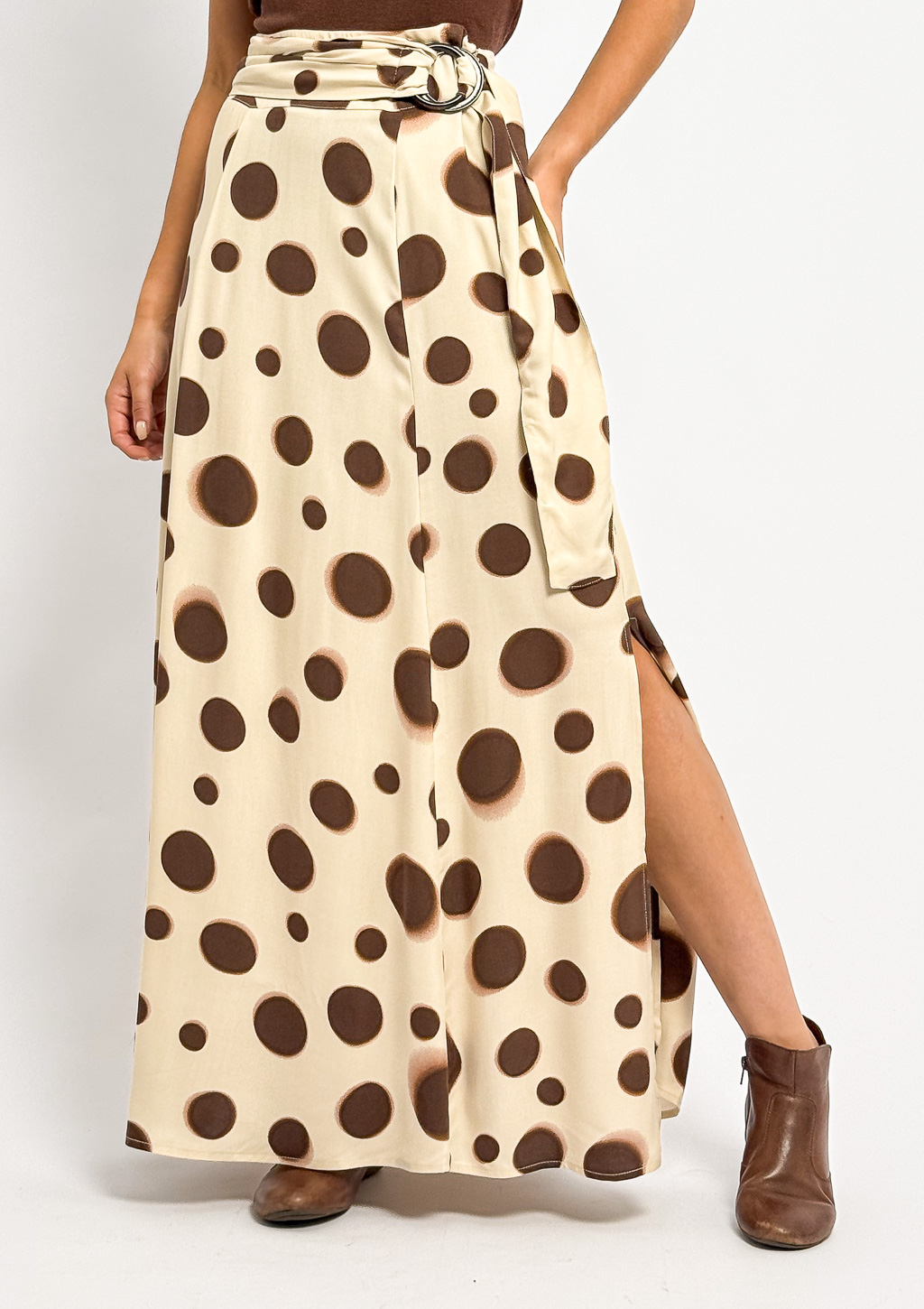 Saia com modelagem cheia de movimento, bolsos faca laterais, comprimento longo, fenda lateral e