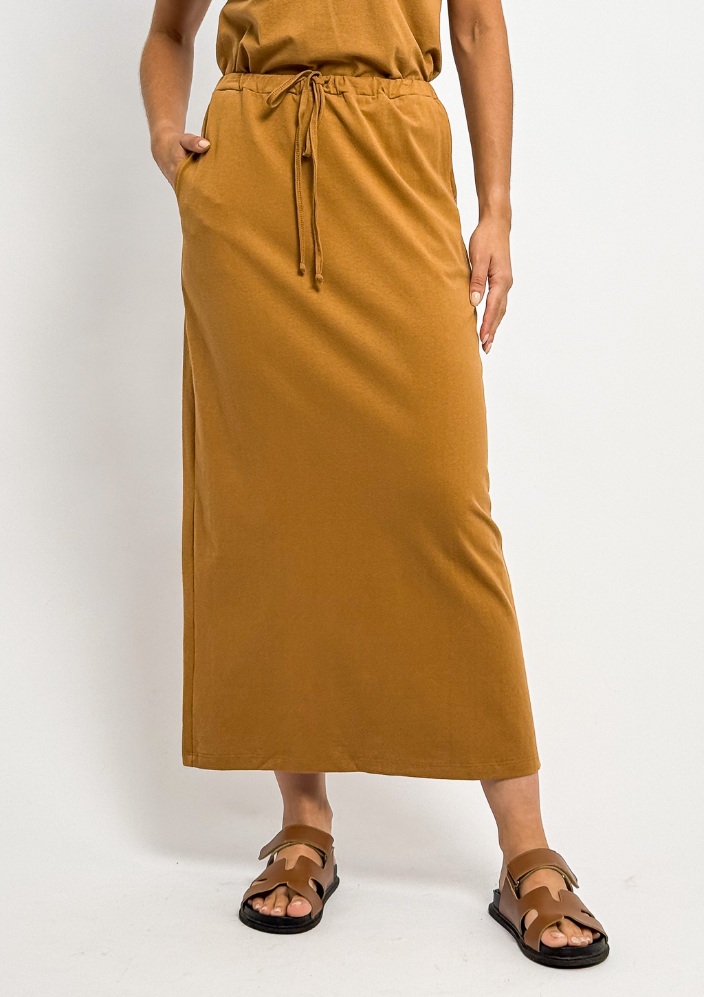 possui comprimento midi e cós com elástico e amarração na cintura.