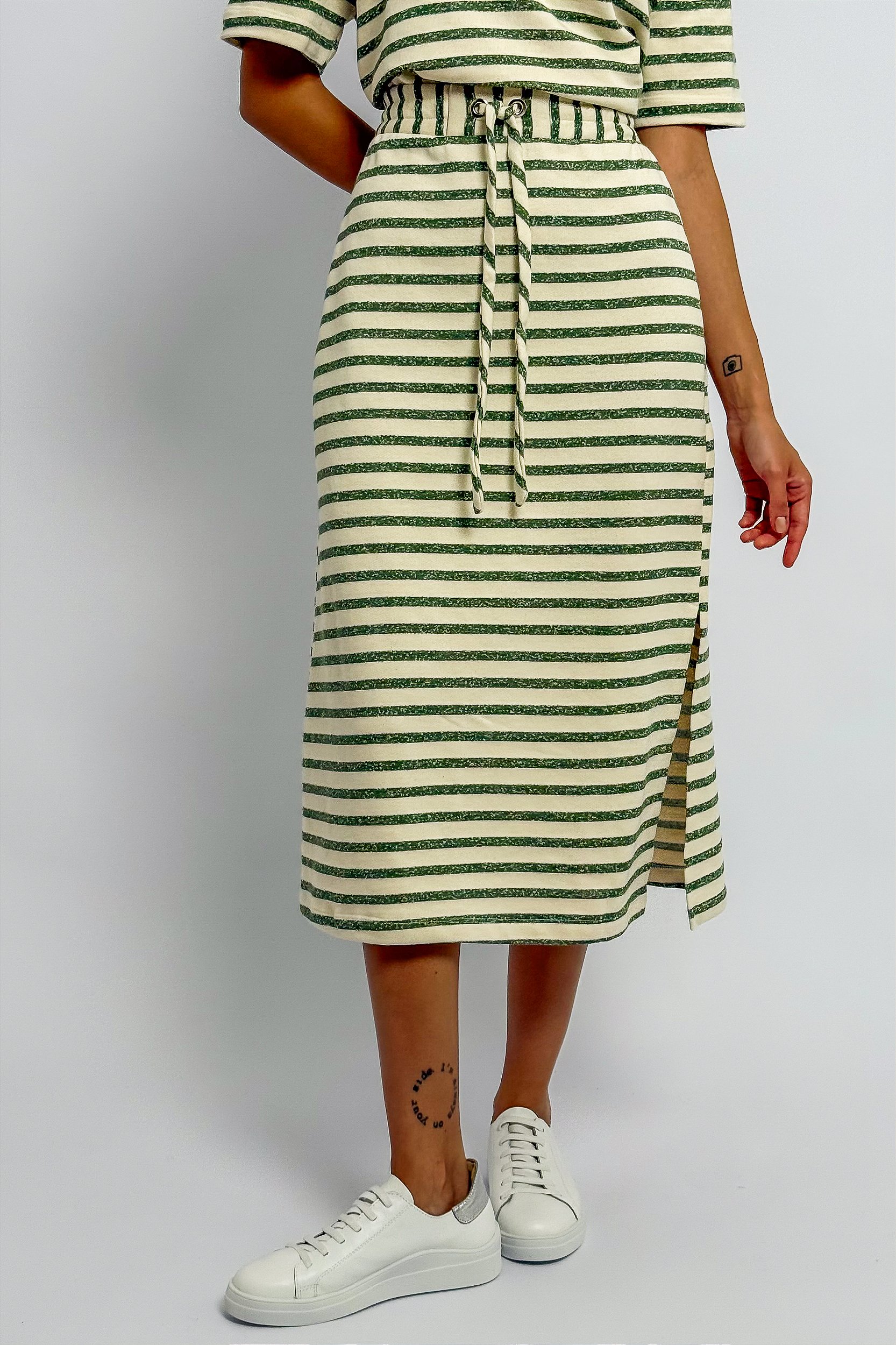 A Saia Midi Moletinho Listrada Fenda Lateral traz uma proposta moderninha e atemporal,