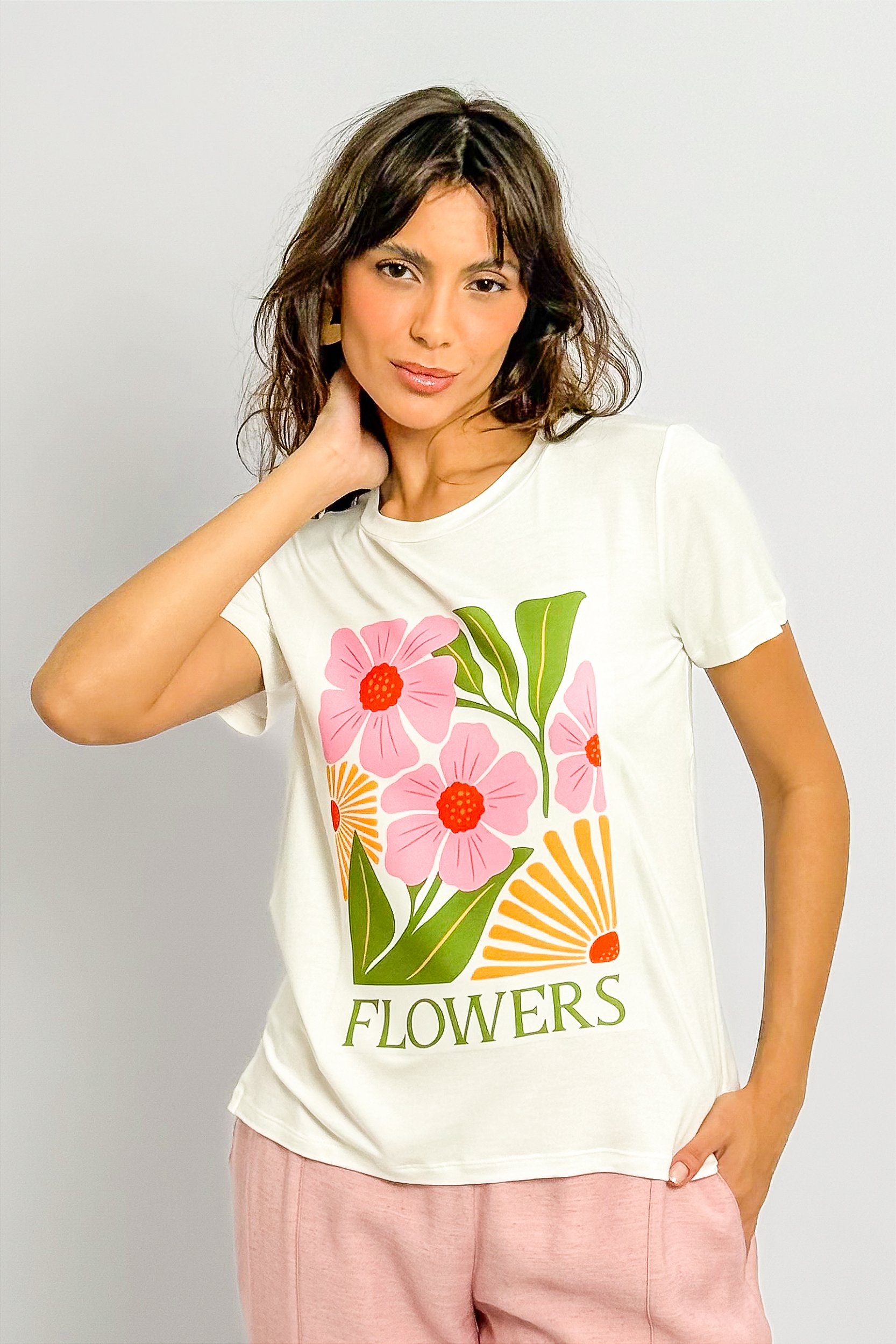 Prática e versátil, a T-shirt Flowers traz um ar divertido e confortável para as produções despojadas.