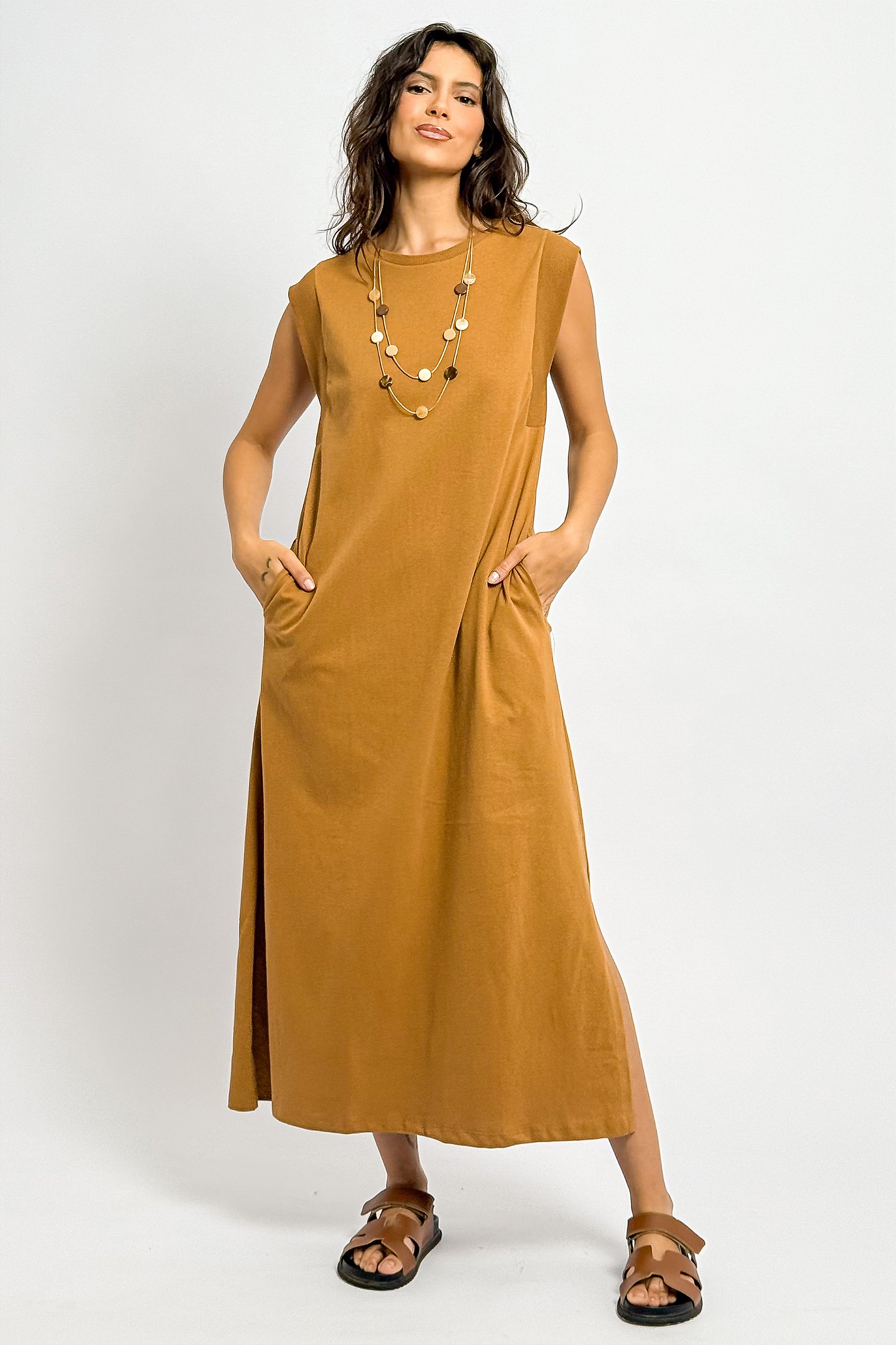 Vestido Longuete Sem Manga Detalhes em Ribana