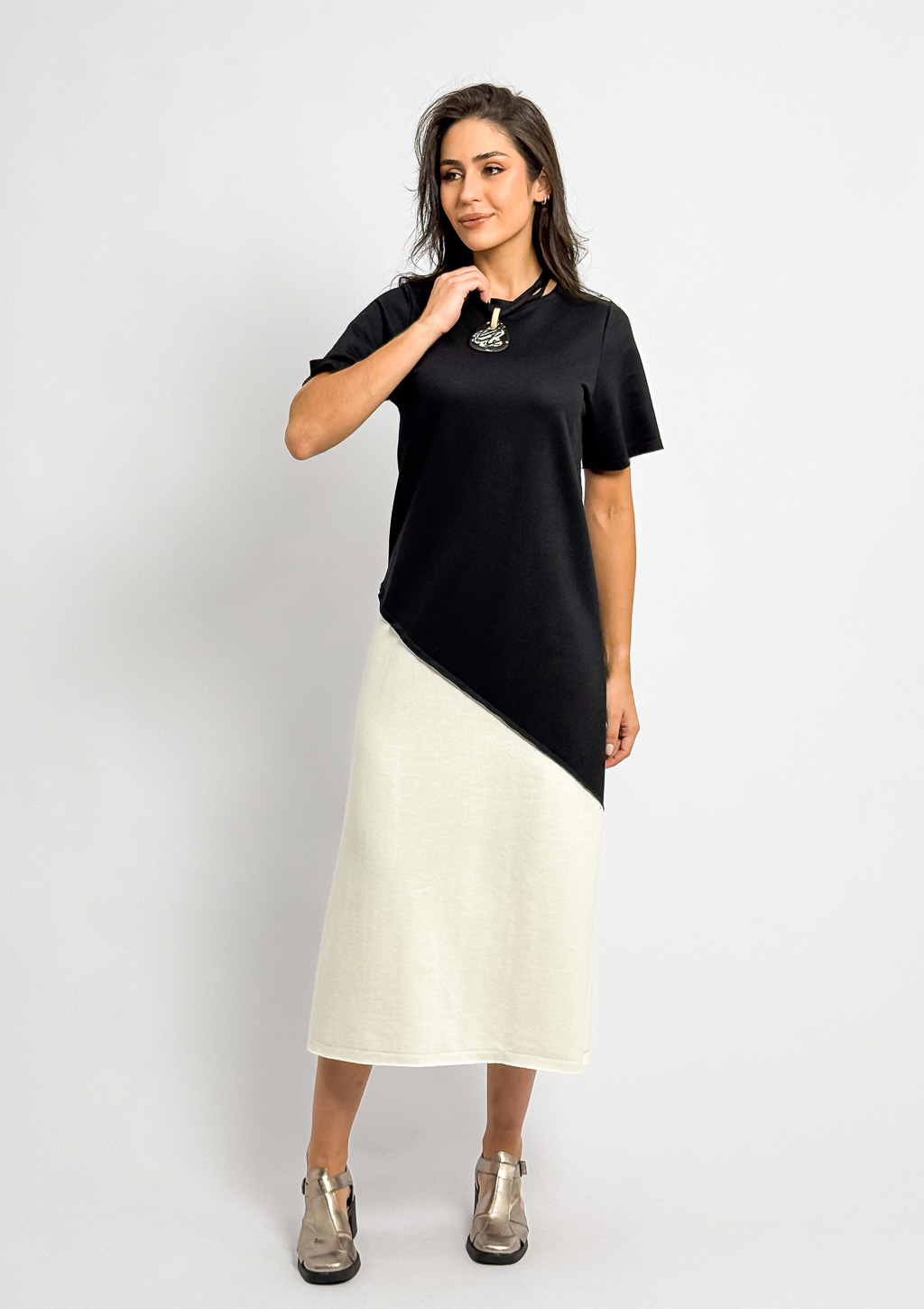 O Vestido Midi Algodão Bicolor Manga Curta combina caimento fluido e sofisticação sem