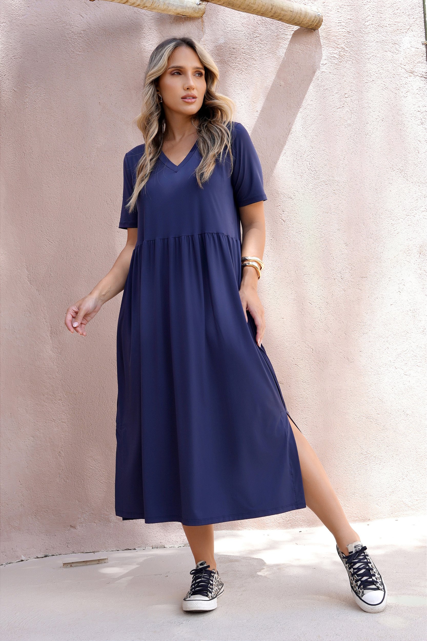Vestido midi, confeccionado em malha fria, mangas curtas, decote v e fendas laterais.