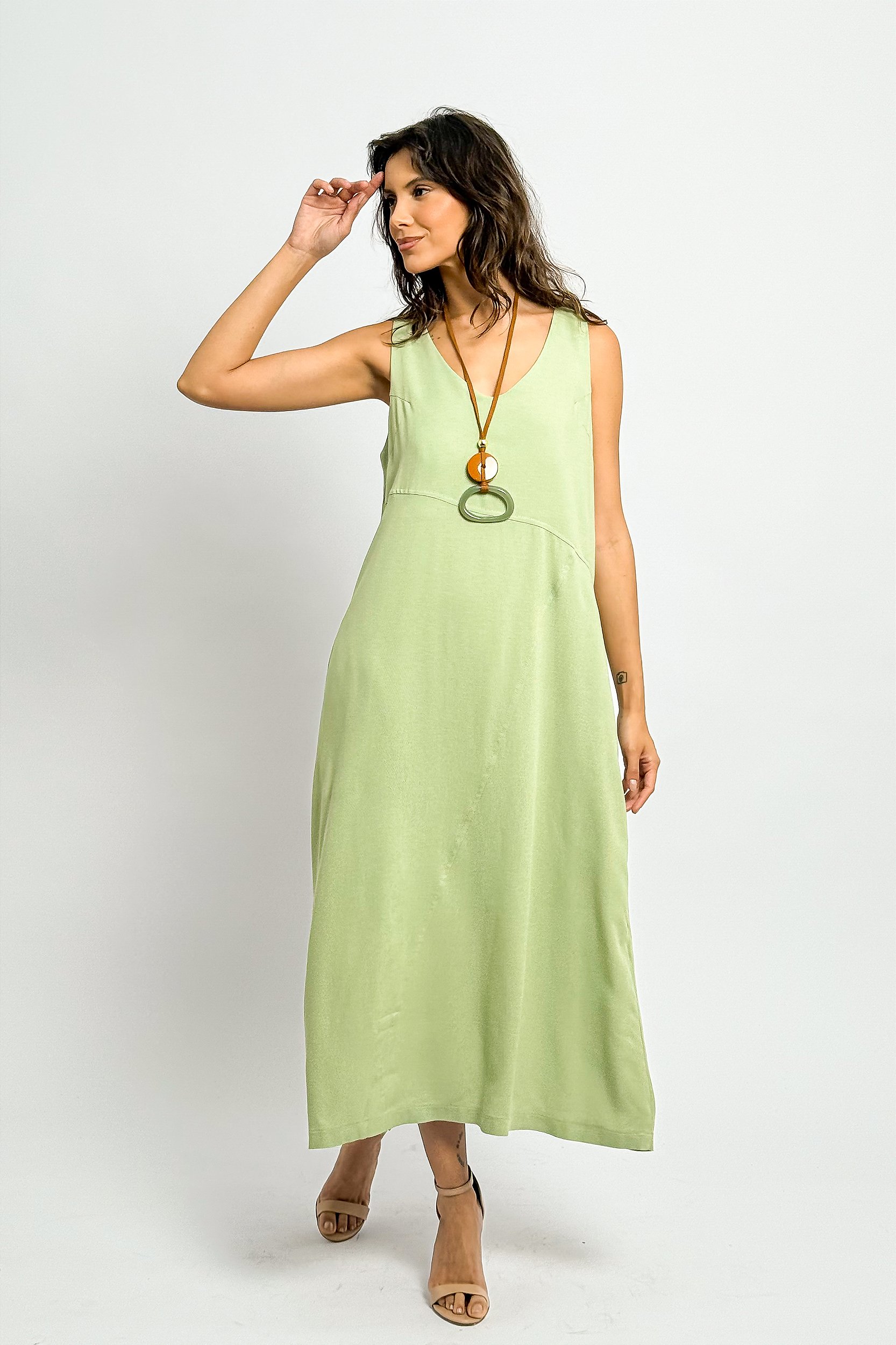 O Vestido Midi Viscolinho Decote V Detalhe Costura tem equilíbrio entre conforto e sofisticação.